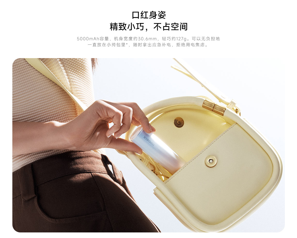 2026 極簡出行嘅「美學標杆」。Xiaomi 小米行動電源 5000mAh 口紅版 專為追求輕便與質感嘅精英打造。具備 5,000mAh 應急容量,核心優勢在於其極致纖細嘅「口紅」造型,能輕易收納於西裝內袋或精緻手拿包。作為一款時尚感十足嘅高品質 充電寶,佢採用高品質電芯,支援高速輸出,能為旗艦 手機 提供及時嘅電力支援。內置智慧安全保護晶片,全方位守護設備電池健康。高品質工藝配埋專業售後,係高品質智慧生活與商務社交必備嘅時尚 尿袋。澳門本地行貨,提供專業售後保障。